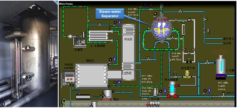 The steam-water separator is a spherical or vertical vessel with built-in high-efficiency separator. A defoaming separator is set at the steam outlet to further separate small water droplets in the steam. The figure shows a newly produced 15t/h steam-water separator. Four-stage steam-water separator is used internally, which makes the separation efficiency up to 99% and meets the steam quality requirements of the superheater. Steam-water mixer utilizes the differential pressure flow suction effect between superheated steam and separated unsaturated brine to spray separated brine into superheated steam in a foggy manner and mix it with superheated steam, thus reducing the temperature of superheated steam and keeping the final steam in an overheated state.