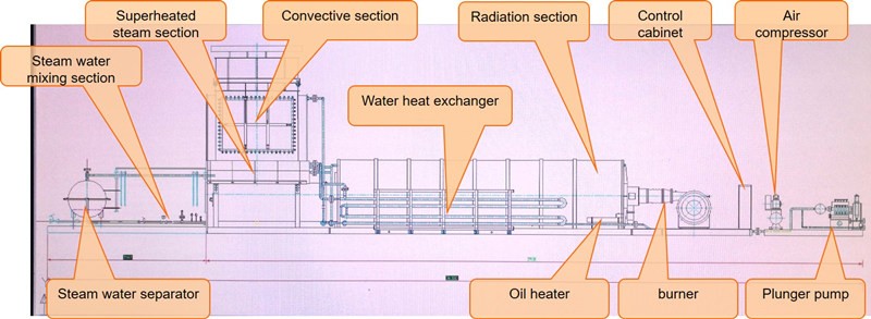 Oilfield steam injection boiler, also known as wet steam generator, is a special steam injection equipment for heavy oil recovery in oil fields. It uses the heat generated by the combustion of gas or fuel oil to heat and vaporize water, generates high temperature and pressure wet steam to inject into the well, and heats the crude oil in the reservoir to reduce the viscosity of heavy oil, thus increasing the fluidity of heavy oil and greatly improving the recovery of heavy oil. RockySea Petro can design and produce various types of oilfield steam injection boilers.